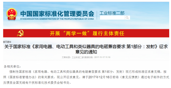 2017年11月17日,国家标准化管理委员会发布了《家用电器、电动工具和类似器具的电磁兼容要求 第 1 部分:发射》征求意见稿,本标准将代替 GB 4343.1 - 2009《家用电器、电动工具和类似器具的电磁兼容要求 第1部分:发射》,并将继续保持为我国强制性国家标准。
