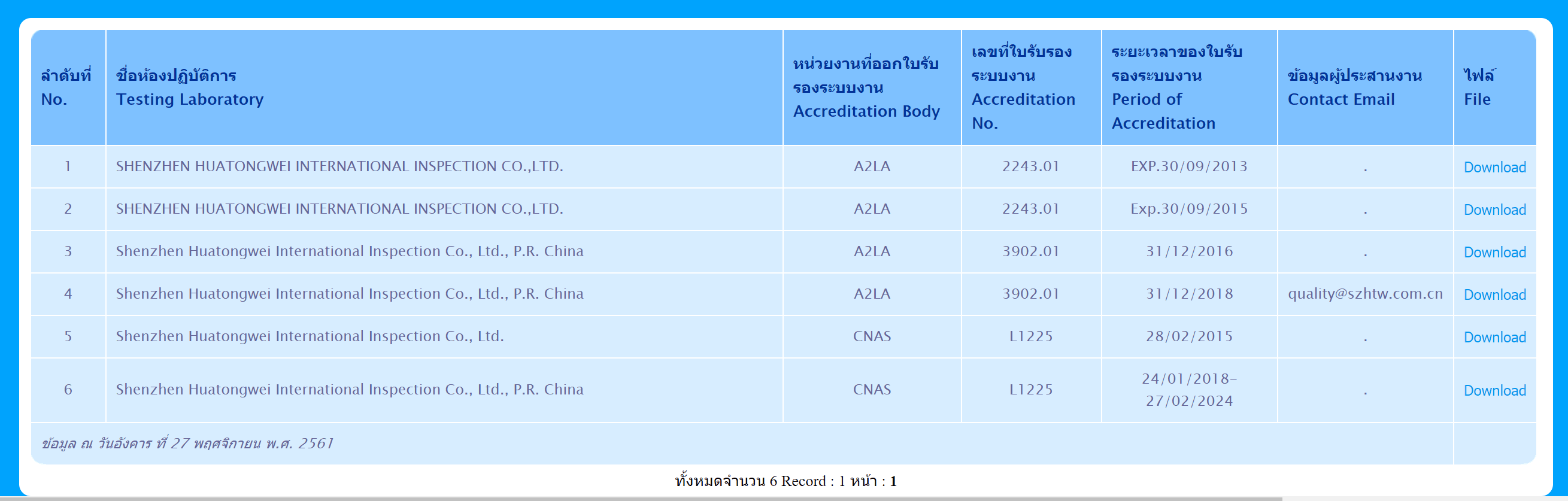 NBTC只接受其列名实验室出具的测试报告。深圳华通威国际检验于2013年7月首次列名其中,此次资质更新后,有效期至2024年2月27日。