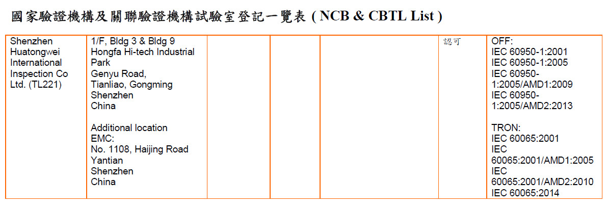 2019年1月11日,深圳华通威实验室顺利完成台湾BSMI注册登记,成为BSMI认可的CBTL,授权范围包含安规标准IEC60950-1和IEC60065。