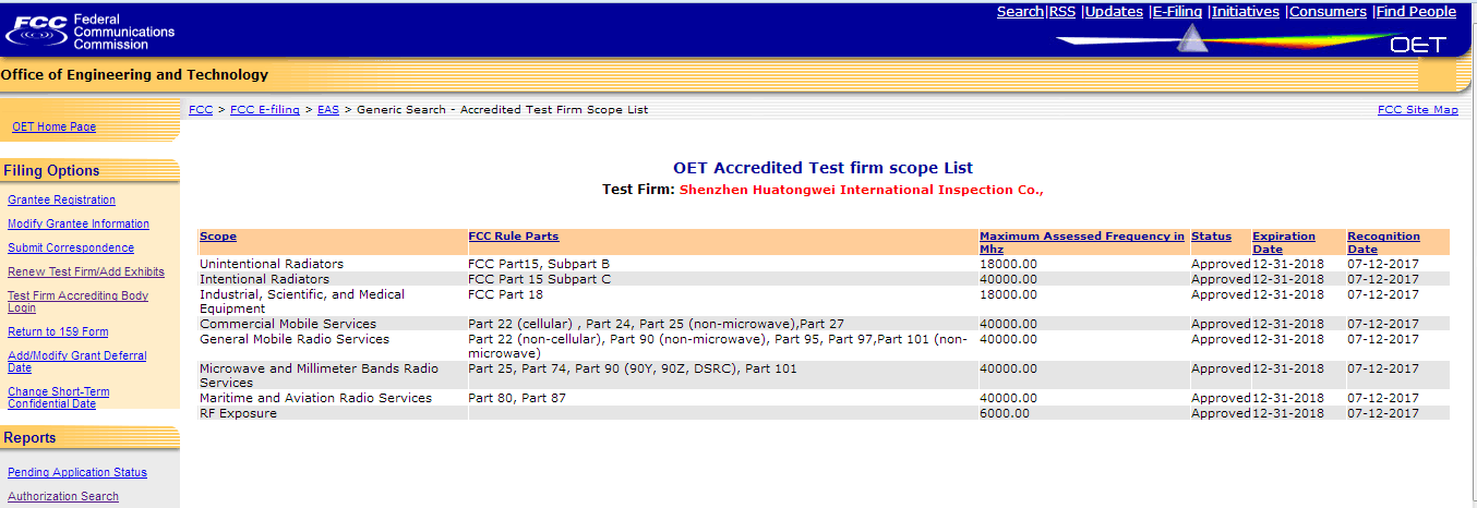 华通威作为中国检验认证集团(CCIC)下属综合性实验室,检测设备先进一流、工程人员技术水平和测试竞争力处于国内领先水平皆是我司能成功成为FCC认可实验室的重要基础。华通威将继续为您提供专业、周到的服务。