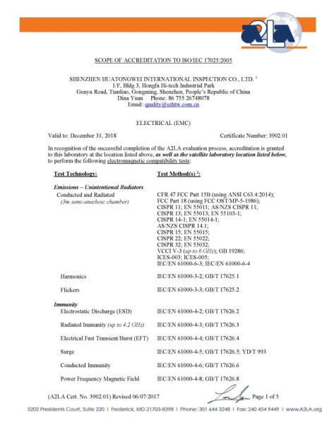 2017年6月7日,华通威已成功通过A2LA扩项申请,FCC授权范围已涵盖常见的电子电器产品!