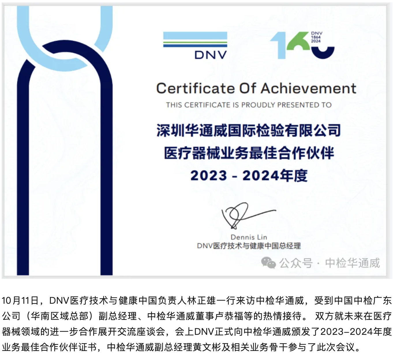 DNV来访中检华通威并颁授年度“医疗器械业务最佳合作伙伴”证书