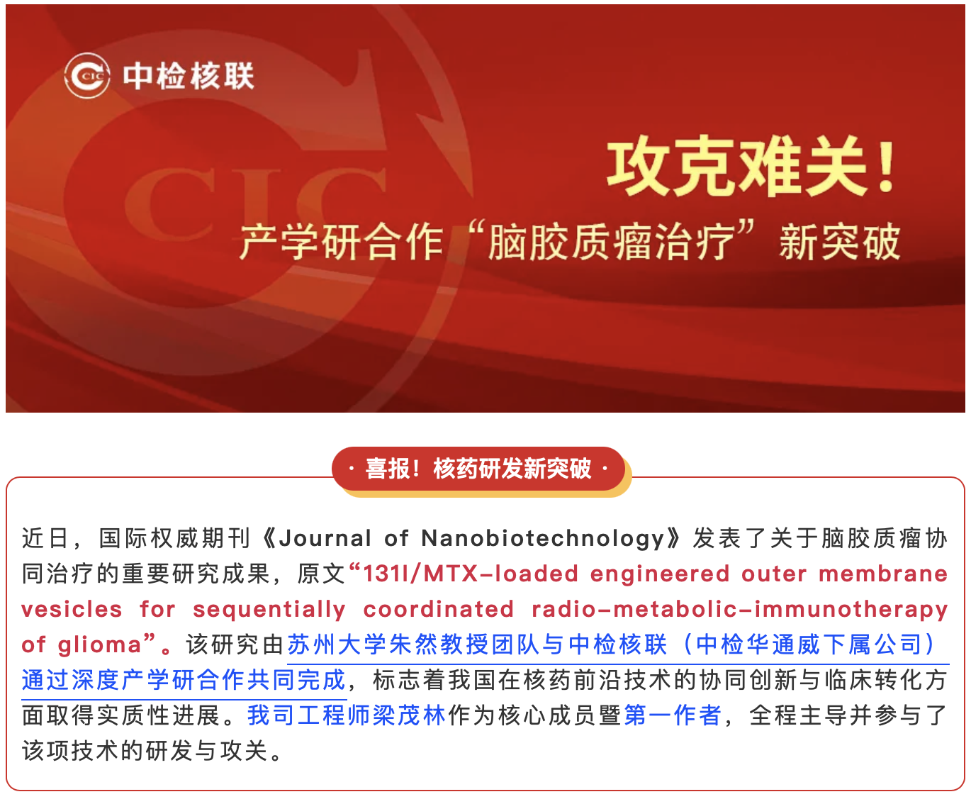 攻克脑胶质瘤治疗难关!中检核联产学研合作引领核药研发新突破