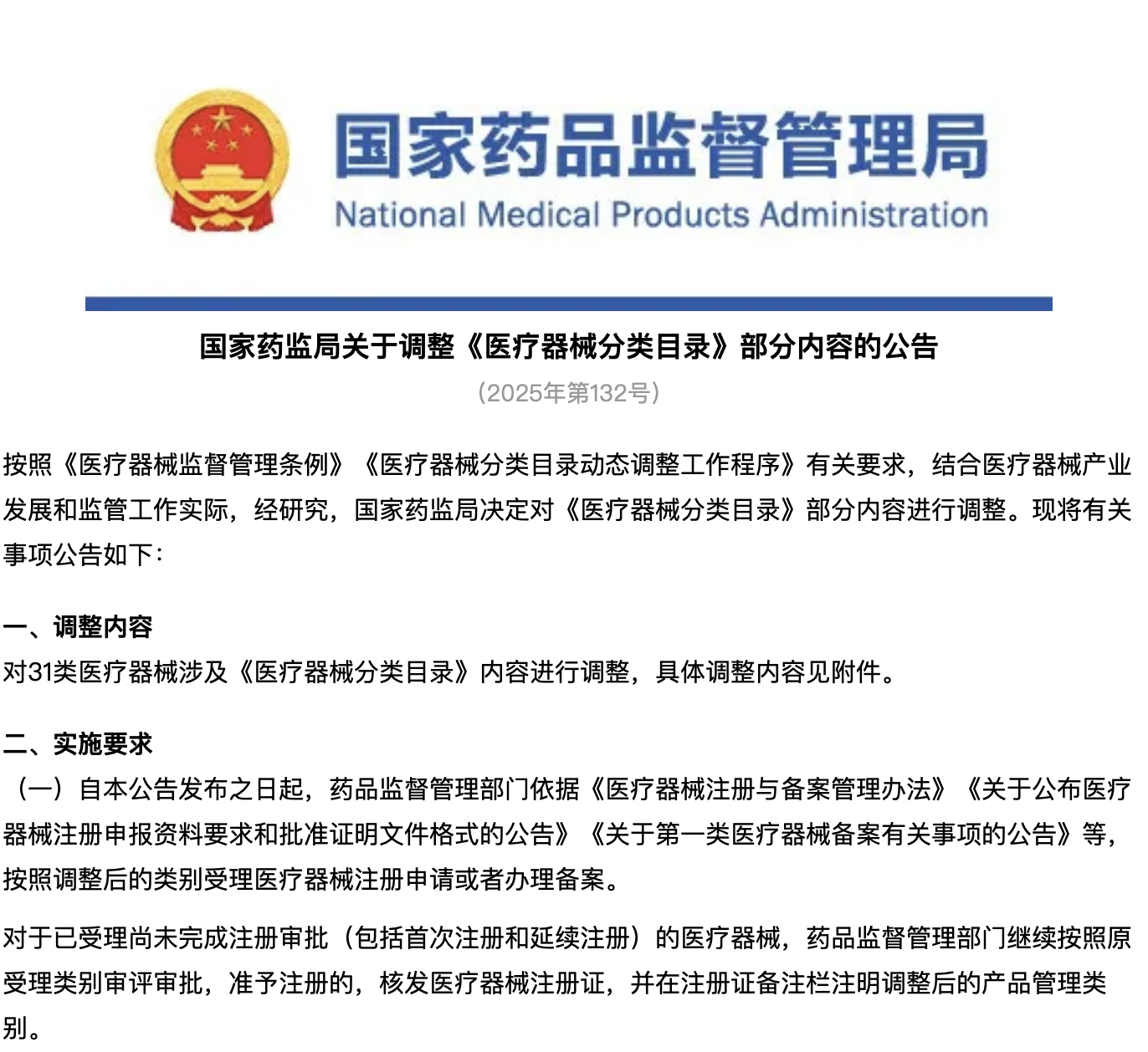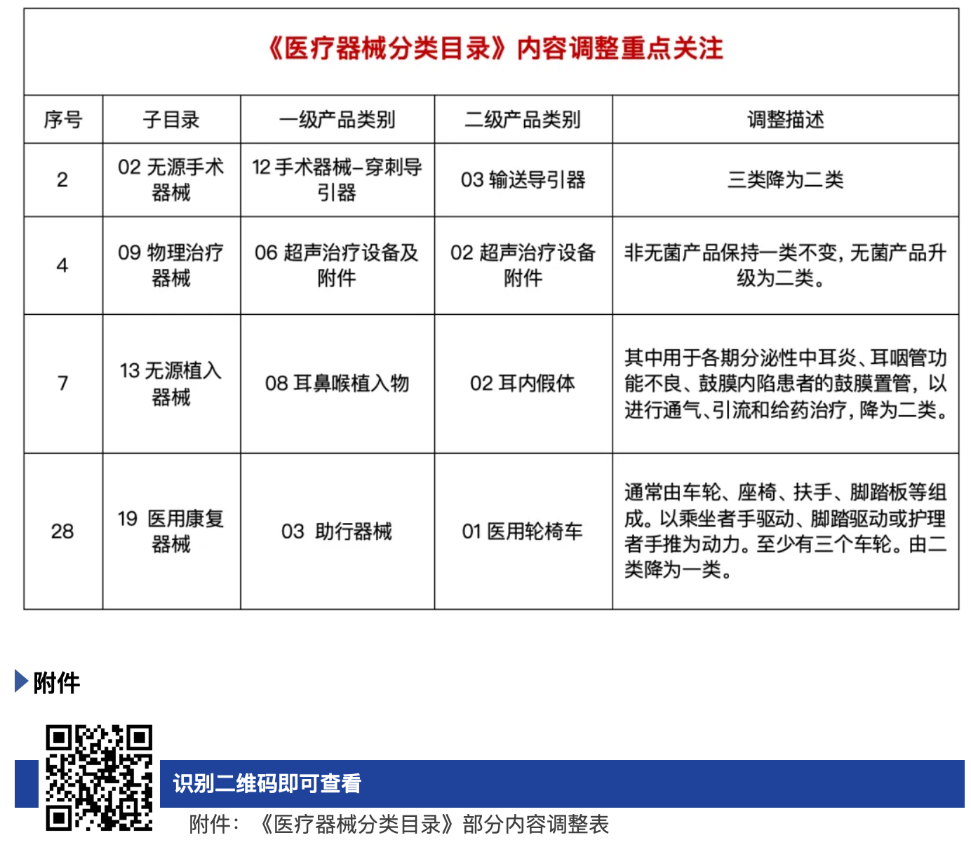 国家药监局关于调整《医疗器械分类目录》部分内容的公告