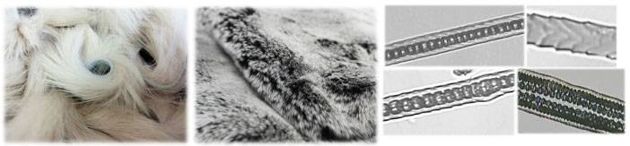 兔毛绒毛的毛髓呈断续状和单列梯状,横截面呈不规则四边形,中间有中腔;獭兔毛壁较薄,中腔为排列整齐的扁平方格。兔毛粗毛髓腔梯状,有双列、三列甚至更多,毛鳞片为木纹斜条形(倒三角)。